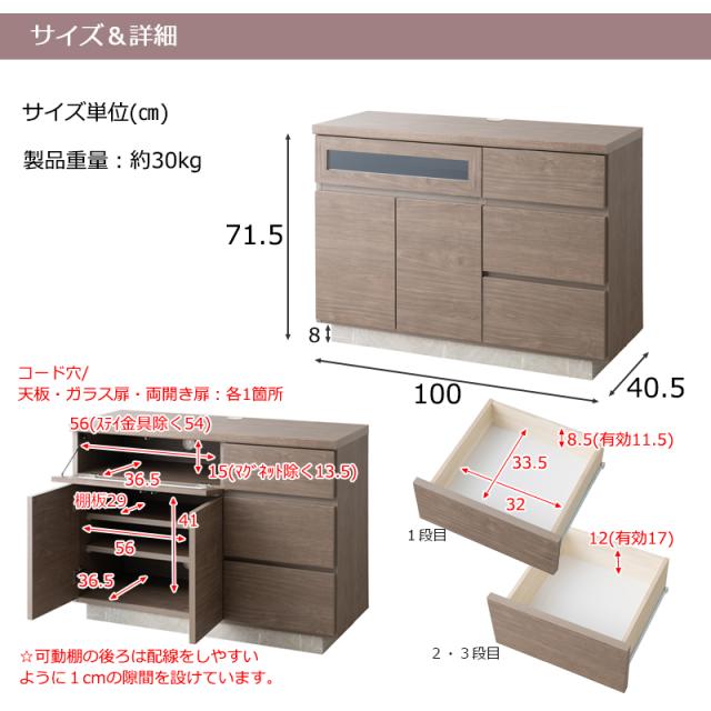 | サイズ | (約)幅100×奥行40.5×高さ71.5cm ガラス扉内寸/(約)幅56(ステイ金具除く54)×奥行36.5×高さ15(マグネット除く13.5)cm 扉内寸/(約)幅56(蝶番除く53.5)×奥行36.5(可動棚29)×高さ41(マグネット除く39.5)cm 引出し内寸/(約)幅32×奥行33.5×深さ(浅)8.5(有効11.5)(深)12(有効17)cm 耐荷重量/天板:(約)20kg、棚板:(約)5kg 商品重量/(約)30kg |