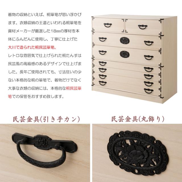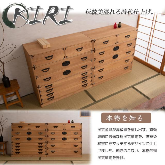 | 説明 | 民芸箪笥といえば欅材をイメージしますが、『室町』は調質効果・防虫効果の高い桐材で仕上げ、風格は民芸箪笥を再現しました。単なる収納という目的だけでなく効果的に収納物を守るという機能的な一面も合わせ持った民芸調総桐箪笥『室町』。桐材は欅のようなハードな木目をおさえ、緩やかで優しい表情になることで和室はもちろん洋室などのフローリングにも合うデザインに仕上げました。重厚な引手と木目のバランスが奇抜すぎず、モダンな印象の室町はデザイン性の高い現代の住宅インテリアに合う。桐材は内部を一定の湿度に保とうとする働きがあるので大事な着物や洋服などを湿気から守る桐箪笥にしまうのがベストで着物や浴衣、洋服など長期保管に最適です。経年変化の風合いを楽しめる白木タイプ、ナチュラルの塗装仕上げタイプと2カラーをご用意。 |