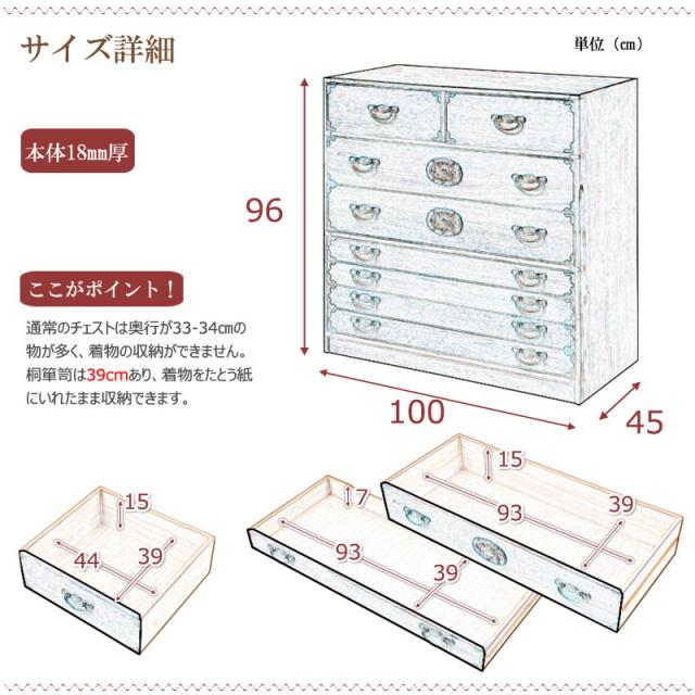| サイズ | 本体:(約)幅100×奥行45×高さ96cm 引出し内寸:(約)幅(小)44(大)93×奥行39×深さ(浅)7(深)15cm 付属品/重ね時用連結金具 商品重量/(約)30kg |