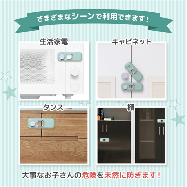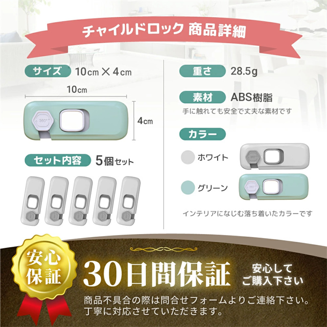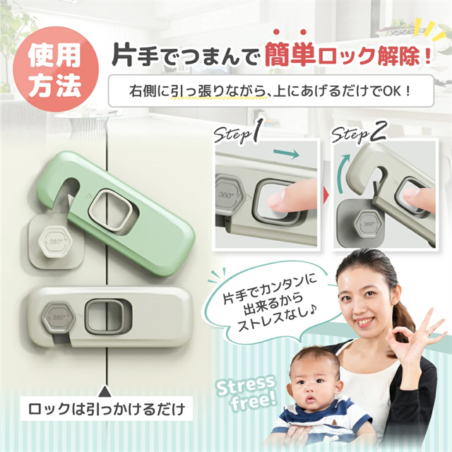 | 特徴 | 【片手でつまんで簡単ロック解除】 よく使う家具や家電。複雑なチャイルドロックは使いずらいですよね? そこで、開け閉め簡単、ストレスのないラクラク操作でロックを解除・施錠。使いやすさにこだわりました! 大人なら片手で右側に引っ張りながら上げるだけでも簡単に開けることができます! もちろんお子様には、安全のため固くて開けにくい構造になっています。 また、お子様の不在時やまとめて家事をする時間帯などロックが不要な場合は、常時オープンモードでお使い頂けます。 【取付・取外簡単】 このチャイルドロックは取り付けにに工具は一切不要です。付属の粘着テープで取り付けるだけ! しっかり固定されて、剥がしても跡がつきにくくきれいにはがせますので賃貸物件にもおすすめです! ※粘着性を保つため、取り付け後は1日ほど放置してから使用してください。 ※冬場など万が一剥がしにくい場合はドライヤーで温めてから剥がすときれいに剥がれます。 また小型でおしゃれなデザインとなっておりますので、お部屋の雰囲気に溶け込みます。 【ABS樹脂素材で安心・安全】 小さなお子様が触ったり口に含んだりしても大丈夫なようにABS樹脂を使用しております。 ABS樹脂とは食器などにも使われている安全性と耐久性の高いプラスチック素材です。 安心してお使いください。 【こんな場所にで使われています】 キッチンや洗面所の扉・引き出し、食器棚、ガラスの引き戸、窓、机、冷蔵庫、救急箱など各種収納ボックス等様々な場所で実際にお使い頂いております。 様々なシチュエーションで使うものだからこそ、安心の『5本セット』と致しました。 |