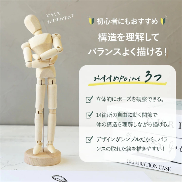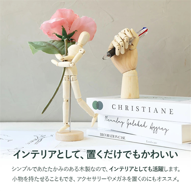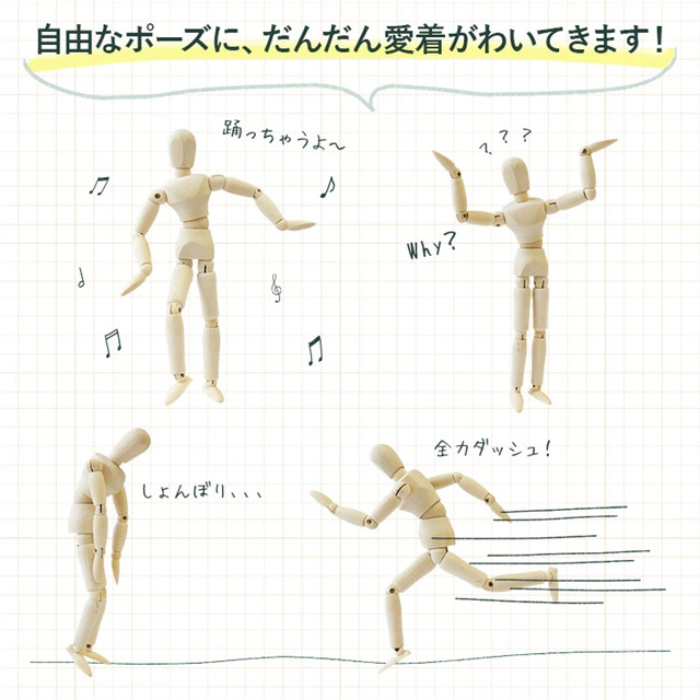 | 商品ポイント | 自在に動かせる人形と右手モデルのセット デッサンやイラストに最適な木製の人形と右手モデルのセットです。 自由に動かせる関節があり、様々なポーズを取ることができます。 【初心者にもおすすめ!構造を理解してバランスよく描ける!】 ★立体的にポーズを観察できる! ★14箇所の動く関節で、体の構造を理解しながら描ける! ★デザインがシンプルだから、バランスの取れた絵を描きやすい! 【台座の付け外しが可能!】 台座をつければジャンプ中など空中の姿勢や不安定な姿勢のポーズができます。 台座を外せば座った姿勢もでき、幅広いポージングが可能です。 【細かいポージングができます!】 指と手首は15箇所の関節を自由に動かせるので、細かいポージングができます。 【インテリアとして置いてもかわいい!】 シンプルであたたかみのある木製なので、インテリアとしても活躍します。 小物を持たせることもできるので、花やペン、アクセサリーやメガネを置くこともできます! いろんなポーズができるので、だんだん愛着がわくこと間違いなし♪ |