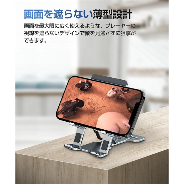 | 特徴 | ★スマホ・タブレット対応★ ■スマホだけでなく、横置きのタブレットにも使用することができます。 ★わずか3mmの極薄設計★ ■折りたたんでポケットに納まるコンパクトサイズ! ■たった68gの軽量で持ち運びに便利。 ★角度調整・高さ調整自由自在★ ■自分好みの使用角度・高さにできるので様々な場面で活躍するスマホスタンドです。 ★一体式&折り畳み式★ ■手のひらサイズで持ち運び楽々!使わない時に折り畳み収納できる。 ★充電しながら使用できる★ ■充電しながらでも快適にスマホ・タブレットが使用できるスタンド設計。 ★画面を遮らない薄型設計★ ■画面を最大限に広く使えるような、プレーヤーの視線を遮らない デザインで敵を見逃さずに狙撃ができます。 ★縦横対応で様々なシーンに★ ■横方向だけでなく、縦方向でのご使用にも対応して、利用シーンに合わせて最適化してくれます! ★丈夫で落ちないホルダー★ ■両ネジで強力に固定して、落下防止!アルミ合金で軸を強力に固定 軸の回転テスト3000回! ★滑り止め&傷防止パット付き★ ■滑りにくいから文字入力もしやすい♪シリコンパッドで操作性アップ&傷防止! ★合金シートで安定性向上★ 重量のある合金シートを使用することでスタンドの安定性を向上。 |
