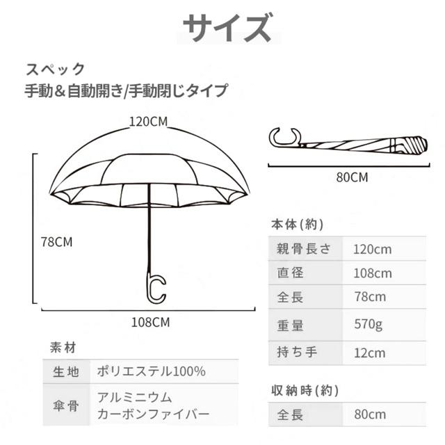 | サイズ | ◆重さ:[手動開閉]550g・[自動開き/手動閉じ]570g ◆直径:108cm ◆収納時長さ:80cm ◆曲面長さ:120cm |