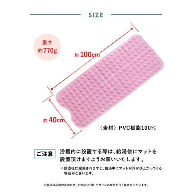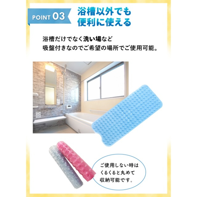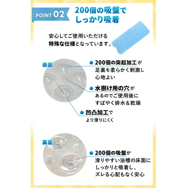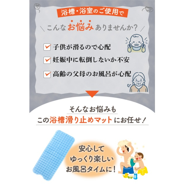 | 特徴 | 【安心!滑らない】浴槽に敷くだけで、底面がすべらず安心。転倒が心配な小さなお子様や、お年寄りのご家族に最適。 【快適な座り心地】柔らか素材で座り心地も◎程よい突起加工で、足裏やお尻を優しく刺激し快適なバスタイムに。 【ピッタリ固定でズレない】マット裏面には200個の吸盤付き。しっかり固定、ズレなく安心。浴槽 or 洗い場のどちらにもおすすめ 【排水もスムーズ】 細かな排水穴が付いているので排水もスムーズ。お湯を抜く際も邪魔になりません 【洗濯機で丸洗いもOK】 洗濯機で洗えるから、お手入れも楽々衛生的 【お好きなサイズにカット可能】 はさみでカットしやすい素材を使用ご自宅の浴槽のサイズや排水溝の場所に合わせて、自由にカットできます 【こんな方におススメ!】小さなお子様お撮り寄りやお体が不自由な方妊娠中の方 |