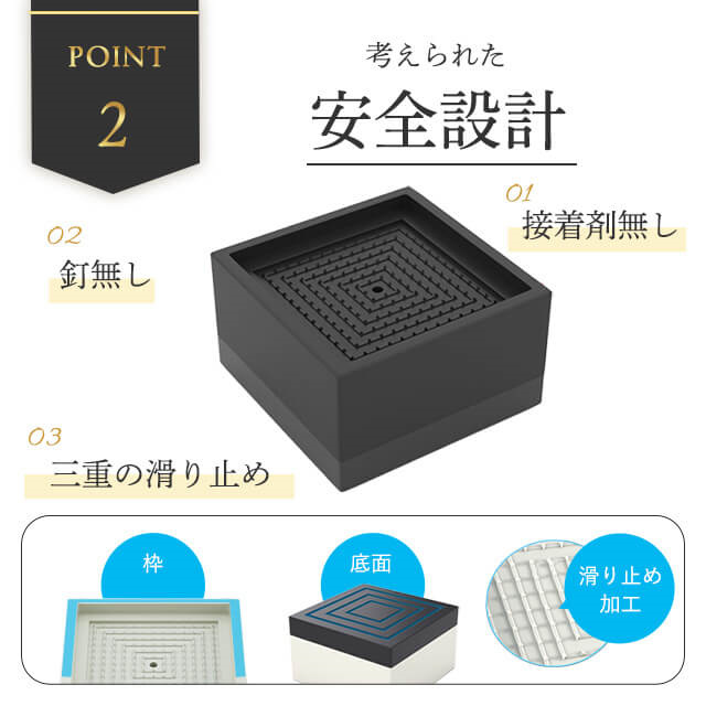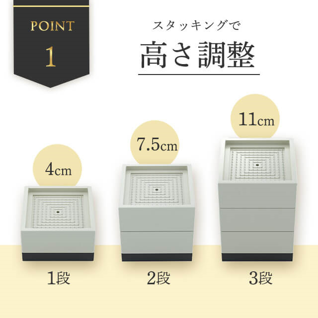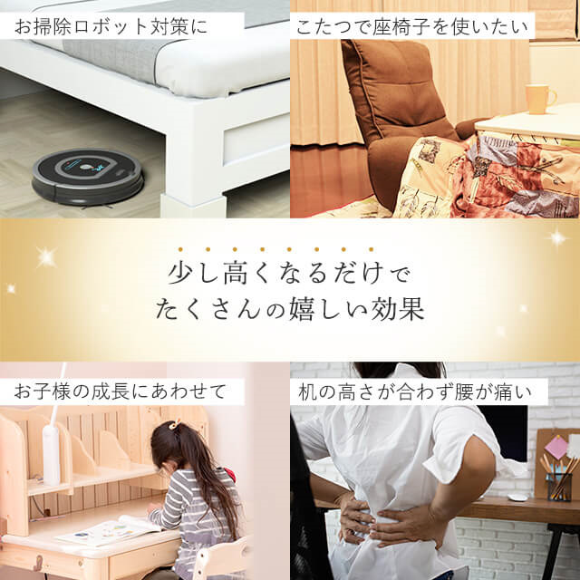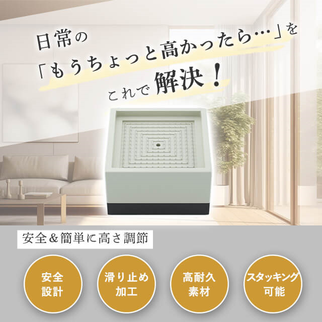 | ポイント | 【高さ調整】 日常の「もうちょっと家具が高かったら..」をこの継ぎ脚が解決! 安全&簡単に高さ調整が可能! 安全設計、滑り止め加工、高耐久素材、スタッキング可能など機能性も豊富です! 【嬉しい効果】 棚やチェスト、ソファー、ベッドなど少し高くなるだけで沢山の嬉しい効果! ・お掃除ロボット対策に ・こたつで座椅子を使いたい ・お子様の成長に合わせて高さ変更 ・デスクの高さが合わず体が疲れる など、継ぎ脚を使うと嬉しい効果が沢山! 【車が乗っても大丈夫】 荷重500kgまで大丈夫! 車が乗っても大丈夫な高耐久素材を使用した継ぎ脚です! だから大型家具や家電にもばっちり使える! 【騒音耐性】 つぎ脚の底面は滑り止め加工を施しており、それにより防音効果も! 底面滑り止め加工で洗濯機などの振動による騒音を軽減! |