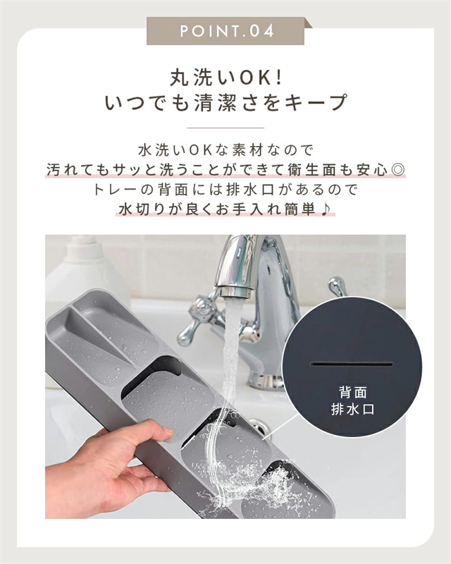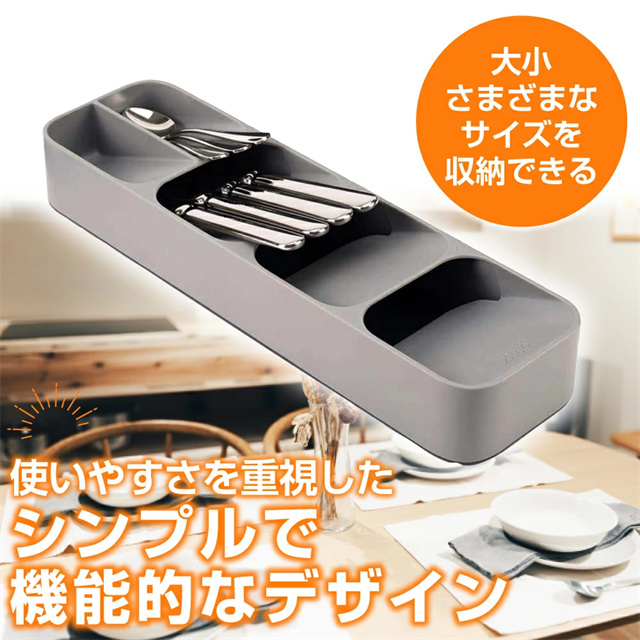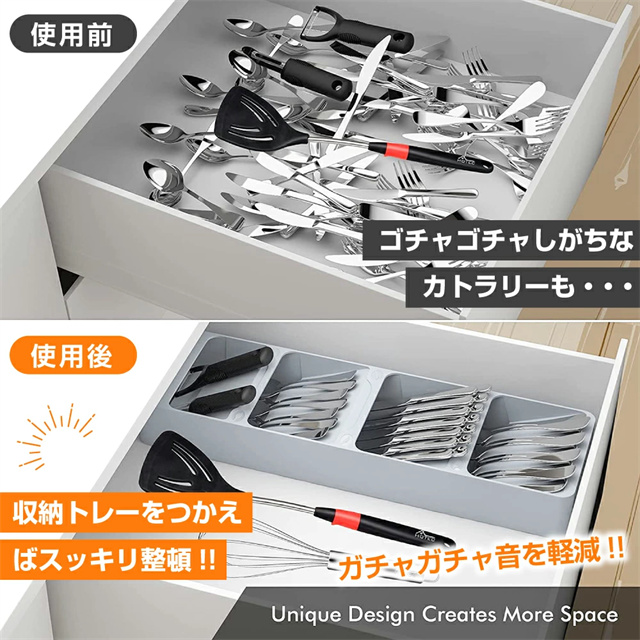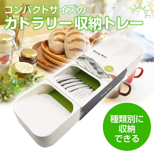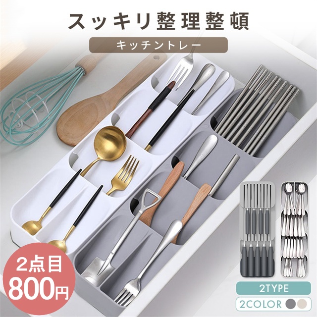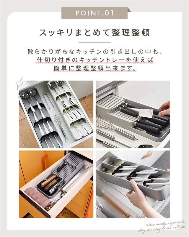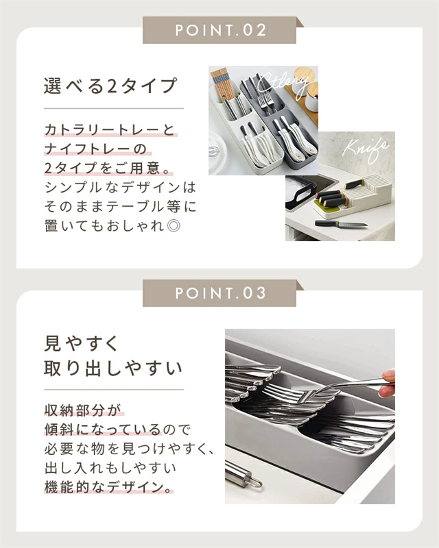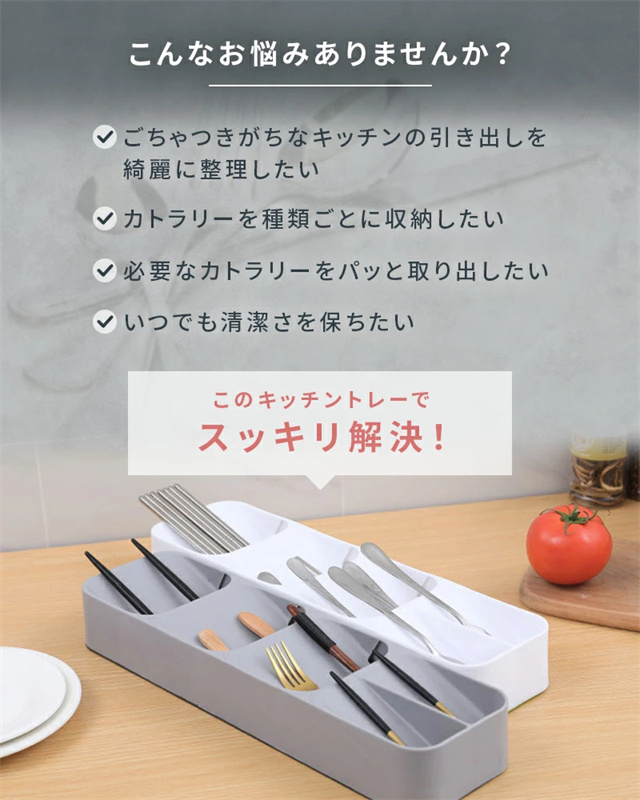 | ポイント | ■スッキリまとめて整理整頓 散らかりがちなキッチンの引き出しの中も、仕切り付きのキッチントレーを使えば簡単に整理整頓出来ます。 ■選べる2タイプ カトラリートレーとナイフトレーの2タイプをご用意。 シンプルなデザインは、そのままテーブル等に置いてもおしゃれ◎ ■見やすく取り出しやすい 収納部分が傾斜になっているので、必要な物を見つけやすく、出し入れもしやすい機能的なデザイン。 ■丸洗いOK!いつでも清潔さをキープ 水洗いOKな素材なので、汚れてもサッと洗うことができて衛生面も安心◎ トレーの背面には排水口があるので、水切りが良くお手入れ簡単♪ |