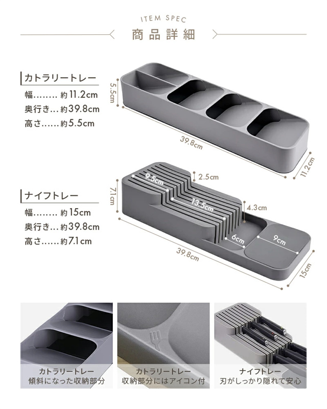| 仕様 | ●サイズ(約) カトラリートレー:幅11.2cm×奥行き39.8cm×高さ5.5cm ナイフトレー:幅15cm×奥行き39.8cm×高さ7.1cm ※寸法は多少の誤差が生じる場合がございます。 ※詳細は説明画像をご参照下さい。 |