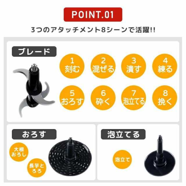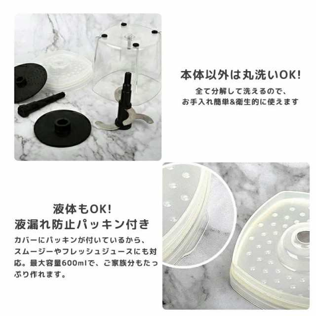 | ポイント | ◆【サイズ】(約)幅12.4×奥行11.7×高さ23.4cm コード長:約1m ◆【重さ】約1.1kg ◆【素材】本体、おろし、泡立てプレート:ABS樹脂 ブレード:ステンレス カップ、カバー:トライタン樹脂 シャフト:ナイロン樹脂 スパチュラ:ポリエチレン ◆【容量】 約500ml ◆【電圧】100V 50/60 Hz ◆【消費電力】260W ◆ 【モーター回転数】24,000回/分(無負荷時) ◆【定格使用時間】ブレード使用時:1分 (1分作動後、10分休止) 泡立て、おろしプレート使用時:2分 (2分作動後、10分休止) ◆【ご注意】 ・フローズンデザートを作るときや、氷を砕くときは、4cm角以下の氷を使用してください。また、1回に入れる氷の数は、カップのMAX印以下にし、パルスプッシュボタンを断続的に繰り返してください。 |