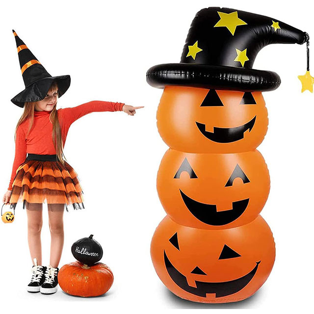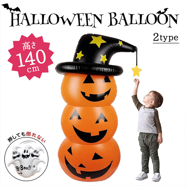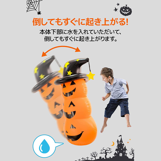 | 使い方 | 1. 立たせる際の重りにするためカボチャの中に水を注ぎます 2. カボチャの部分を膨らませます 3. 同様に黒い帽子の部分を膨らませます 4. バルーンが直立するまで水を足したら完成です |