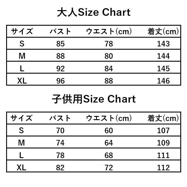 | サイズ | ◆大人Size(CM):S M L XL バスト:85 88 92 96 ウエスト:78 80 84 88 着丈:143 144 145 146 ◆子供用Size(CM):S M L XL バスト:70 74 78 82 ウエスト:60 |