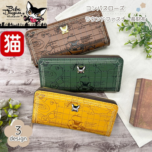 財布 猫 レディース 長財布 ラウンドファスナー 大容量 猫のダヤン べべダヤン コンパスローズ ブラウン イエロー グリーン 猫柄 わちふぃーるど 猫雑貨 猫グッズ 人気 便利 女性 かわいい おしゃれ ギフト プレゼント 猫好き 【 誕生日 】