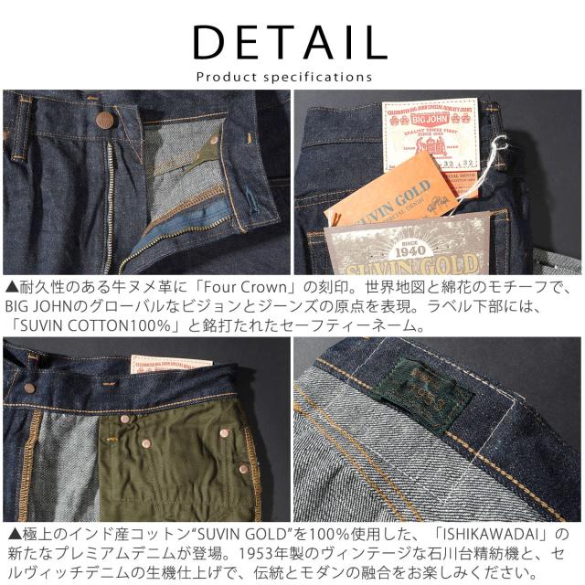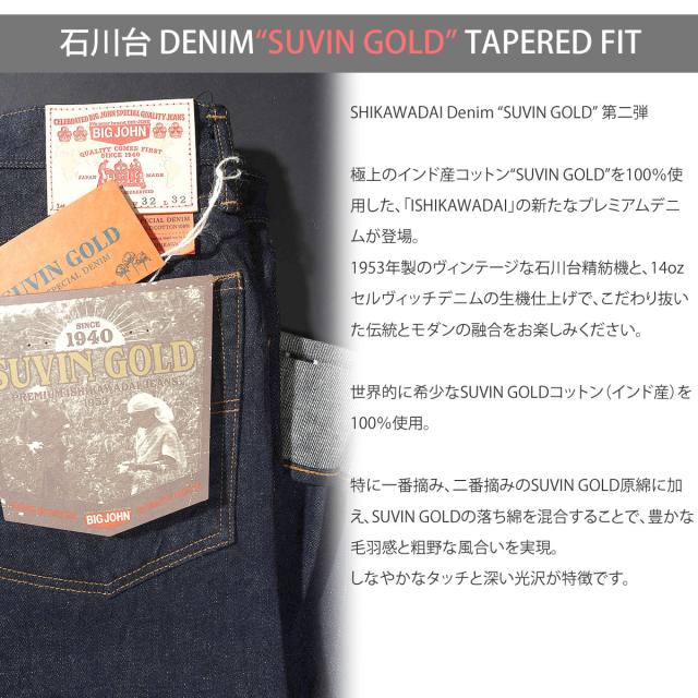 【 世界的に希少なSUVIN GOLD使用 】スビンゴールド 石川台デニム テーパードジーンズ ビッグジョン 14oz セルビッチデニム インド綿 BIG JOHN ISHIKAWADAI DENIM TAPERED FIT ( S1956WS (001) ) テーパードフィット ジッパーフライ インディゴセルビッジ メンズ アーベン