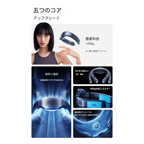 【全身爽快!衝撃の上下風道搭載】首の後ろにも上下に搭載することで、首元から全身に心地よい清涼風を届け、汗をかず、お化粧も崩れにくい。