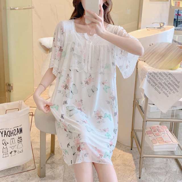 ネグリジェ 蝶 花柄 半袖 春 秋 パジャマ ワンピース ゆったり レース レディース ルームウェア 産後 マタニティ 入院 ルームウェア ルームサプリ 肌に優しい フリル スクエアネック 大きいサイズ 無地 薄手 部屋着 JITIFA