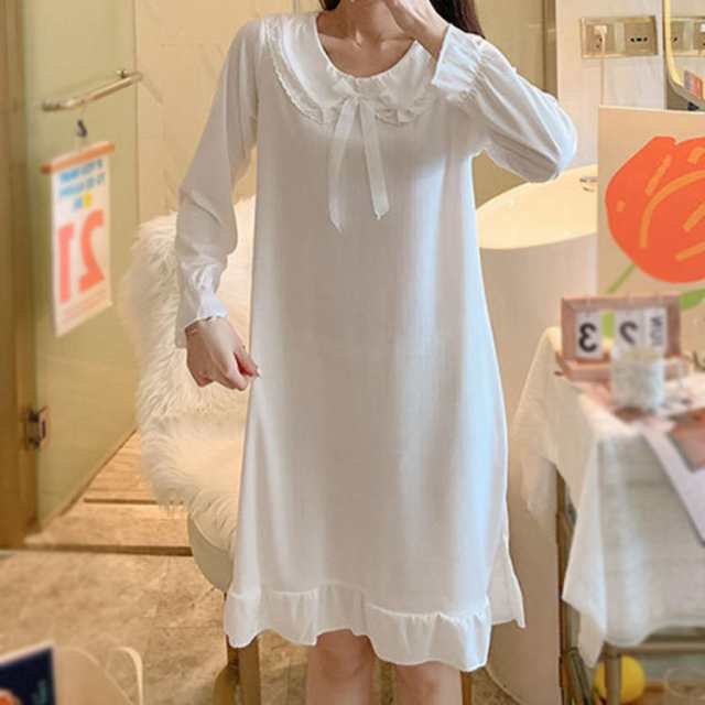 パジャマ ロング ネグリジェ 長袖 レディース 大人用 淑やか 部屋着 ゆったり ルームウェア 姫系 ワンピース パジャマ フリル リボン レース 春 秋 冬 ブルー リボンタイ ロング 薄手 ルームウェア レース付き 柔らかい 無地 ゆったり JITIFA