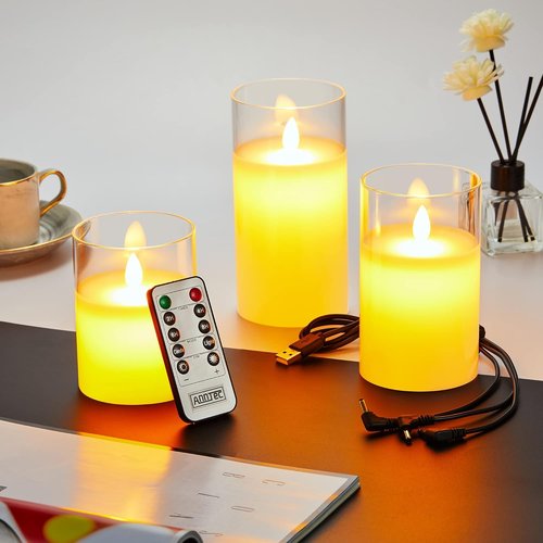 AnnTec LEDキャンドルライト クリアガラスホワイト ロウソク 本物の炎のようにゆらめく3点セット 暖色光 火を使わない ゆらゆら揺れる 安全 省エネ 専用リモコン付き 明るさ調整 USB充電式 LEDキャンドル