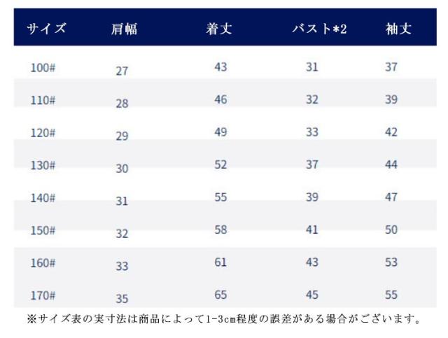 | サイズについての説明 | サイズ 肩幅 着丈 バスト*2 袖丈 ※サイズ表の実寸法は商品によって1-3cm程度の誤差がある場合がございます。 |