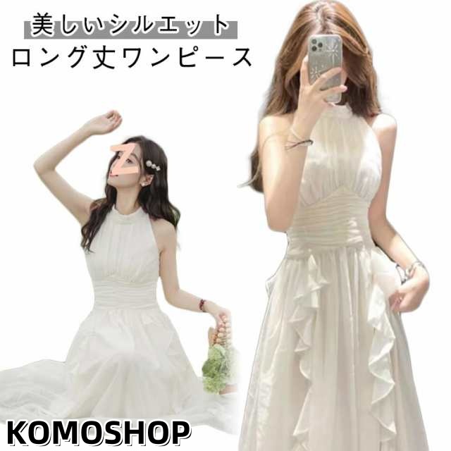 フリル ノースリーブ レーディスワンピース シフォン ワンピース ハイウエスト ロングワンピース ロング丈 裏地付き ウエストマーク オフィスカジュアル きれいめ フェミニン