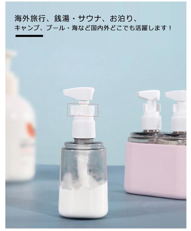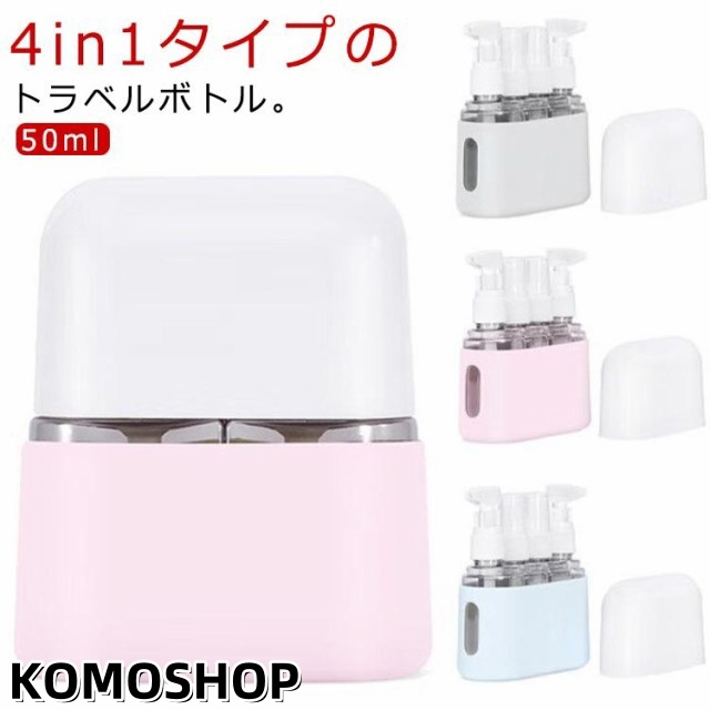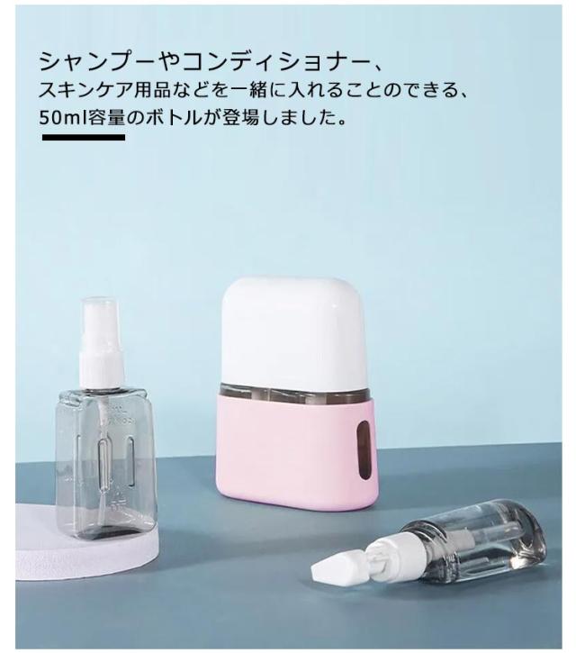 | 4in1タイプのトラベルボトル。【50ml】 シャンプーやコンディショナー、スキンケア用品などを一緒に入れることのできる、50ml容量のボトルが登場しました。 収納ケース(10cm×4.5cm×1.2cm)は機内持ち込み可能サイズです! 旅行や出張だけでなく、日常生活での様々なシーンで活躍します。 ボトルは自立して置けるデザインになっており、外から内容量が見える透明なので、残量が一目でわかります。補充のタイミングを逃しません! 注ぎ口が大きく入れやすい。フタも取りやすいため、楽に補給できます。 海外旅行、銭湯・サウナ、お泊り、キャンプ、プール・海など国内外どこでも活躍します! 用途に合わせて1つのボトルに詰め替えてください。 | |