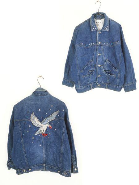 レディース 古着 90s CAPRI 鳥 鷹 ワッペン 星 スタッズ デニム ジャケット S 古着