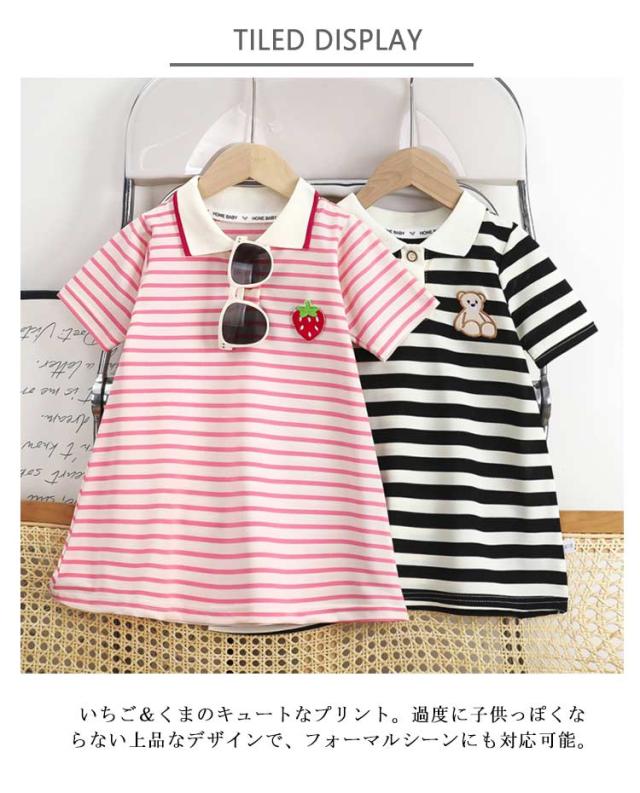 ポロワンピース スクール風ワンピース 女の子 夏用 キッズ Aライン子供服 半袖 薄手ポロシャツドレス いちご柄 くま柄 通気性良い ゆったりワンピ 柔らか ボタン開閉式襟 軽量 カジュアル おしゃれ プレゼント ギフト