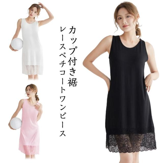 カップ付き ペチコート ワンピース タンクトップ 裾レース 涼感 涼しい インナー レディース スリップ 膝丈 ロング 静電気防止 透け防止 透けない ドレス