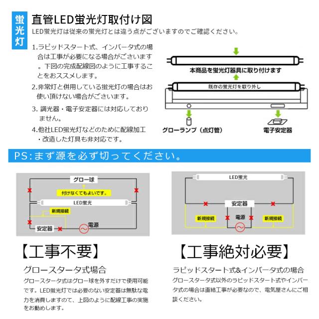 - ※両側給電対応 グロー式工事不要! グロースターター方式の器具は、グロー点灯管を取り外すだけで、そのままご使用できます。 ※ ラピッドスタート式&インバータ式の場合、工事は必要です。 *電気資格者による配線工事を行うようお願い致します。