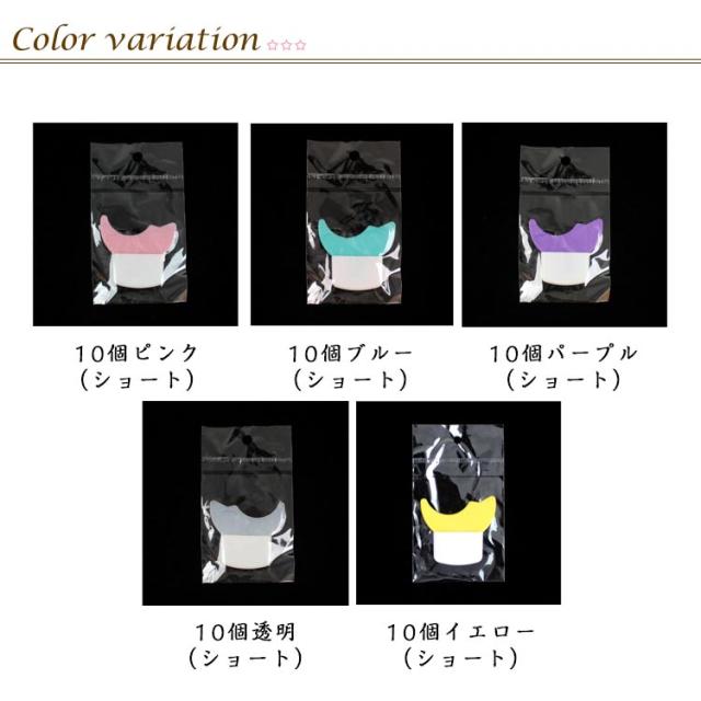 | 色 | 10個ピンク(ショート) 10個ブルー(ショート) 10個パープル(ショート) 10個透明(ショート) 110個イエロー(ショート) 10個ピンク(ロング) 10個ブルー(ロング) 10個パープル(ロング) 10個透明(ロング) 10個イエロー(ロング) |