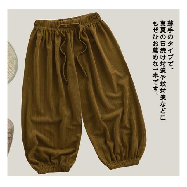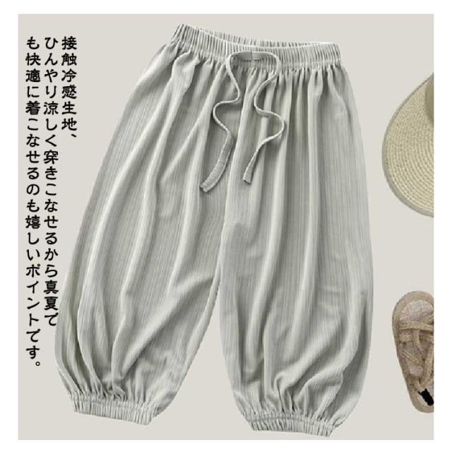 | 今季流行のサルエルパンツのようなキッズゆったりパンツが登場! 接触冷感生地、ひんやり涼しく穿きこなせるから真夏でも快適に着こなせるのも嬉しいポイントです。 ウェストと裾が柔らかいゴムで締まって、長時間着用しても窮屈さなどは一切なく楽です。 薄手のタイプで、真夏の日焼け対策や蚊対策などにもぜひお薦めな1本です。 | |