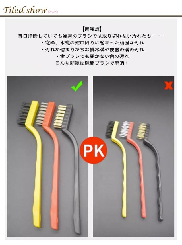 | キレイにできなかった隙間や溝の汚れに! すきまブラシ 6本セット 6タイプ 【問題点】 毎日掃除していても通常のブラシでは取り切れない汚れたち・・・ ・窓枠、水道の蛇口周りに溜まった頑固な汚れ ・汚れが溜まりがちな排水溝や便器の溝の汚れ ・歯ブラシでも届かない角の汚れ そんな問題は隙間ブラシで解消! 【解決策】 ・薄型&ハードブラシで隙間にこびり付いた汚れをしっかり掻き出す。 ・今まではどうにもならなかった溝に溜まった汚れもキレイにできてしまいます。 ・先端がアーチ状になっているから、歯ブラシでも無理だった角や隙間の汚れもしっかり落とす。 | |