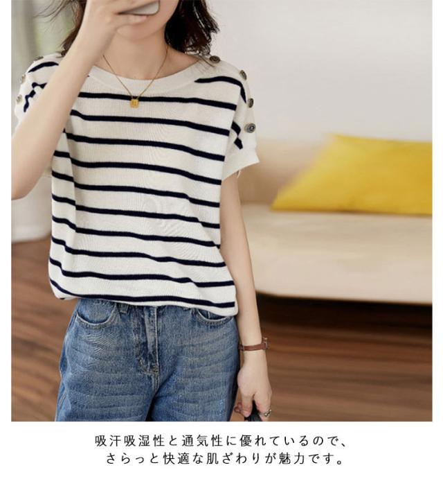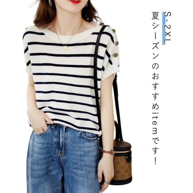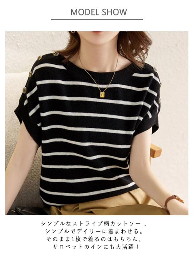 夏 半袖Tシャツ ゆったり レディース トップス クルーネック ストライプ Tシャツ フレンチスリーブ ボタン付き カットソー 柔らかい 薄手 インナー Tシャツ 体型カバー 黒 白 ブラック ホワイト 大きいサイズ