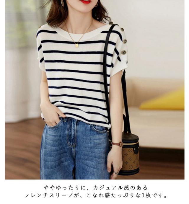 | 夏シーズンのおすすめitemです! シンプルなストライプ柄カットソー 、シンプルでデイリーに着まわせる。 デニムやフラットトングサンダルでカジュアルに合わせても、デニムパンツやテーパードパンツとフラットパンプスなどきれいめなアイテムとも相性! ややゆったりに、カジュアル感のあるフレンチスリーブが、こなれ感たっぷりな1枚です。 吸汗吸湿性と通気性に優れているので、さらっと快適な肌ざわりが魅力です。 そのまま1枚で着るのはもちろん、サロペットのインにも大活躍! | |