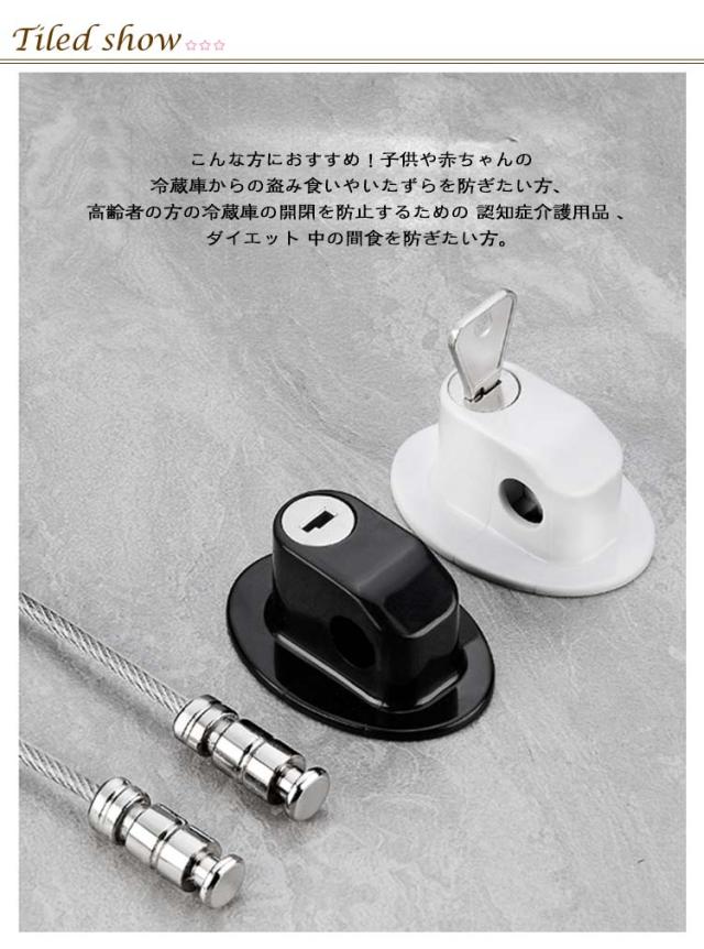| 鍵付きの 冷蔵庫ドアロック 。 こんな方におすすめ!子供や赤ちゃんの冷蔵庫からの盗み食いやいたずらを防ぎたい方、高齢者の方の冷蔵庫の開閉を防止するための 認知症介護用品 、ダイエット 中の間食を防ぎたい方。 3M社製の強力両面テープで、 冷蔵庫 や キャビネット の ドア に簡単装着。両面テープで装着するので、ドリルやネジは不要で、取り付け・取り外しも簡単。 冷蔵庫のドア 以外にも、書類棚 や キャビネット 、 物置 、プリンターの 引き出し 、 ドアやトレイに後付けで 鍵を設置。開けっ放し防止 。 キーを回して固定しているワイヤーを外すと、ドアオープン。 | |