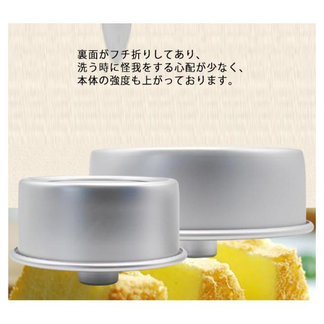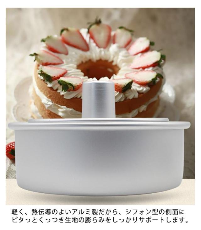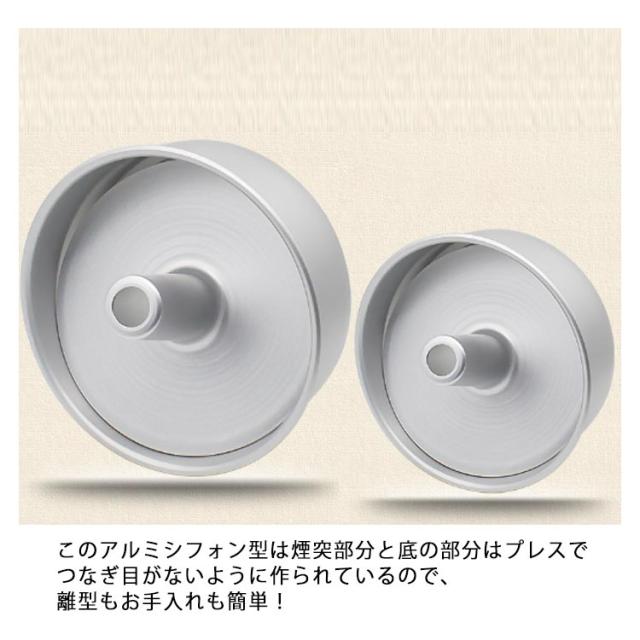 | シフォンケーキもスポンジケーキも作れるケーキ型。 2種類の底板付きでシフォンケーキ、スポンジケーキどちらも作れるケーキ型です。 軽く、熱伝導のよいアルミ製だから、シフォン型の側面にピタっとくっつき生地の膨らみをしっかりサポートします。 表面は薄いアルマイト被膜を作る処理(アルマイト加工)を施してあるので酸化・腐食しにくく、光沢も長持ちです。 このアルミシフォン型は煙突部分と底の部分はプレスでつなぎ目がないように作られているので、離型もお手入れも簡単! 焼き上がったケーキが取り外しやすい底取れタイプです。 裏面がフチ折りしてあり、、洗う時に怪我をする心配が少なく、本体の強度も上がっております。 お得な17cm(6インチ)と20cm(8インチ)の2点セットです。 | |