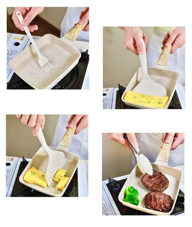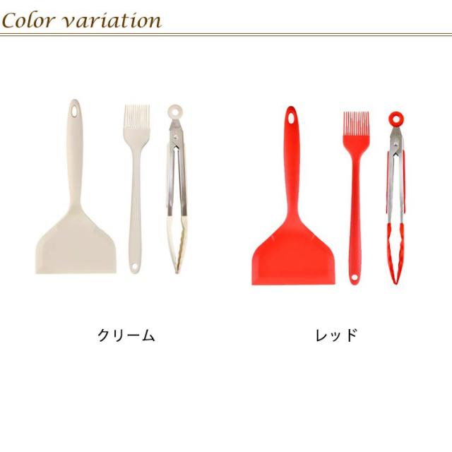 | 毎日の料理が楽になるキッチンツール3点セット。 卵焼きが綺麗に巻けるワイドターナー、焼肉などに便利なトング、また小油料理が手軽にできる油ブラシがセットになって、美味しく、健康な料理が簡単に楽しめるキッチンツール。 耐熱温度は-40℃〜220℃、口に入ってもよい食品グレードシリコンで作られて、安全安心。 スタイリッシュでオシャレなデザイン、見た目と実用性を両立できて、キッチンを明るく、調理気分も上がります。 | |