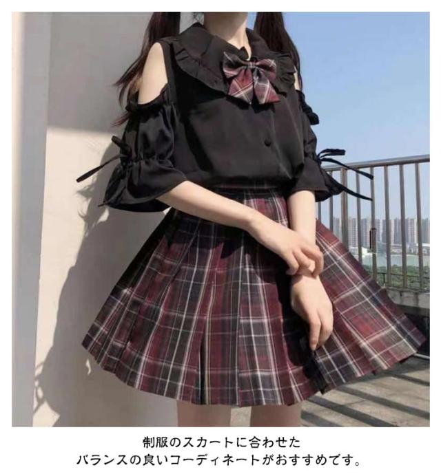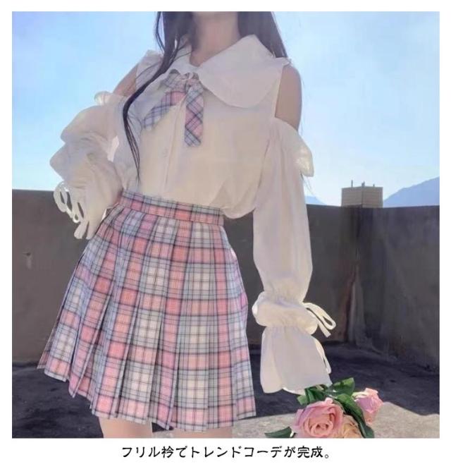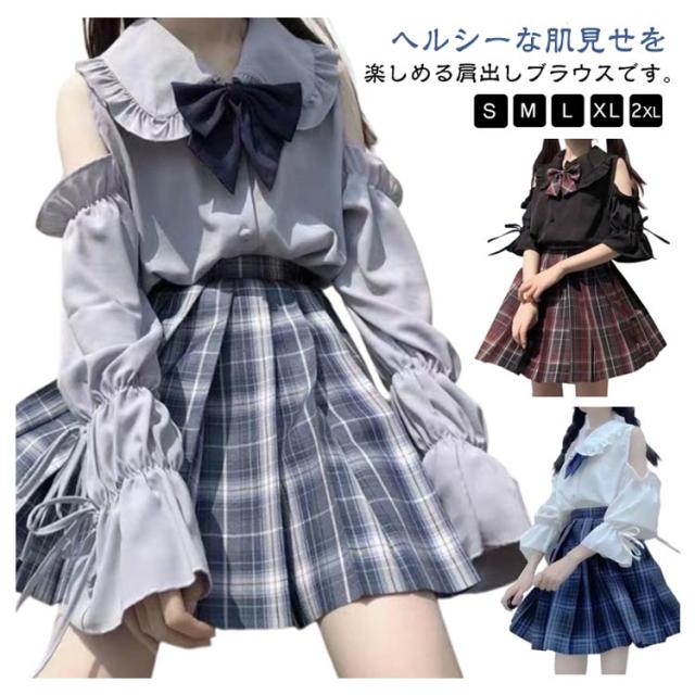 肩出し 可愛い フリル衿 量産型 長袖 かわいい リボン付き シャツ ブラウス 制服 服 スクールシャツ シャツブラウス 女子高校生 コスプレ 半袖 春夏秋 肩出し トップス 学生服 無地 レディース ゴスロリ カジュアル 肩あき