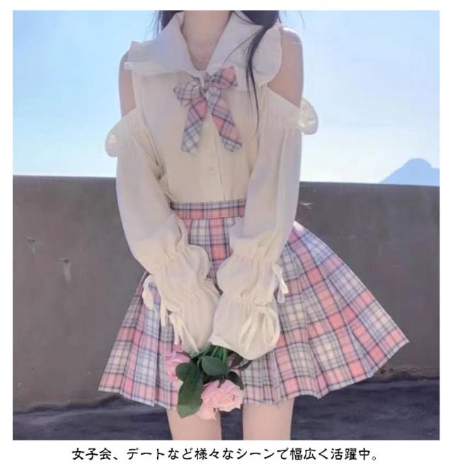 半袖 コスプレ 肩出し トップス フリル衿 リボン付き 肩出し シャツ 制服 スクールシャツ ロリータ かわいい 学生服 女子高校生 シャツブラウス 可愛い 春夏秋 無地 ブラウス 量産型 服 レディース ゴスロリ カジュアル 肩あき