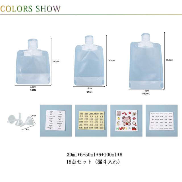 小分け容器 詰め替え容器 詰め替え パウチ 18点 小分けボトル トラベルボトル 便利グッズ 旅行用 化粧品 化粧水/乳液/シャンプーに対応 漏れ防止 旅行用 省スペース 持ち運び 30ml 50ml