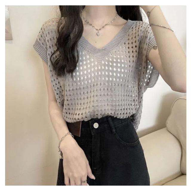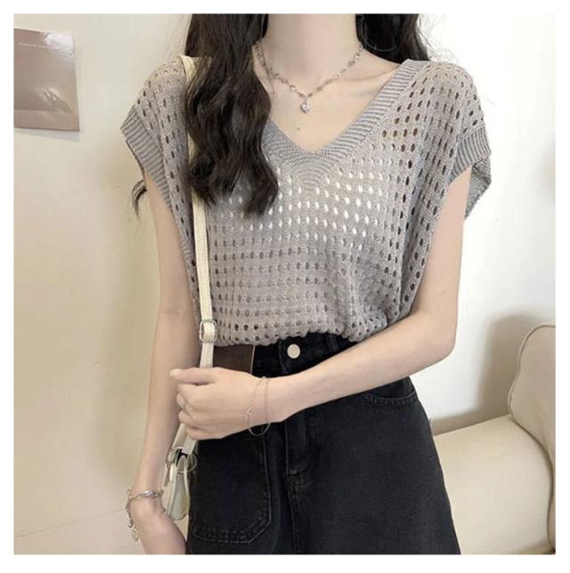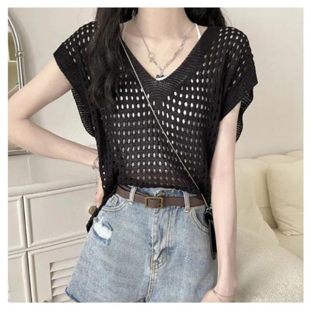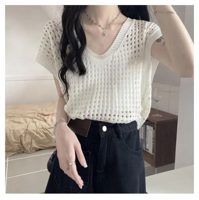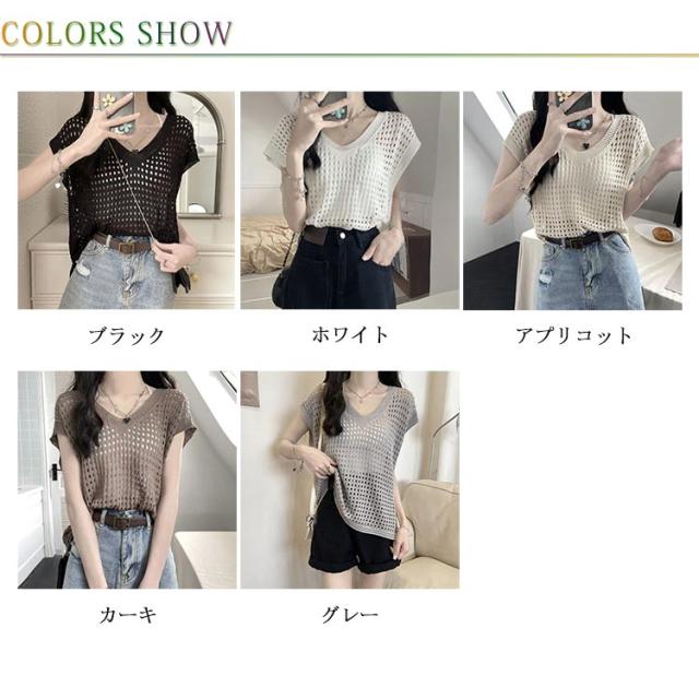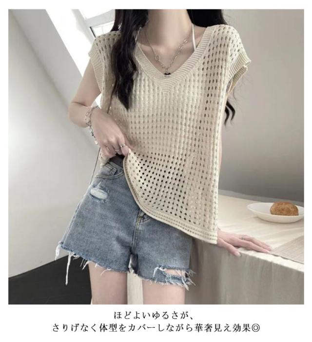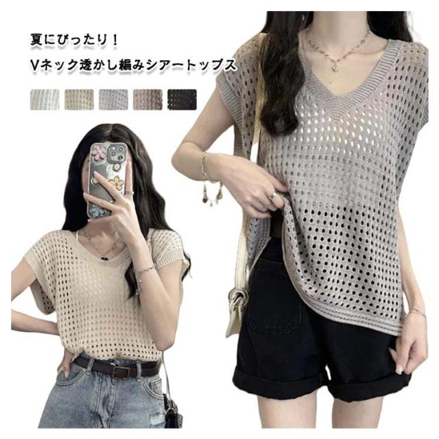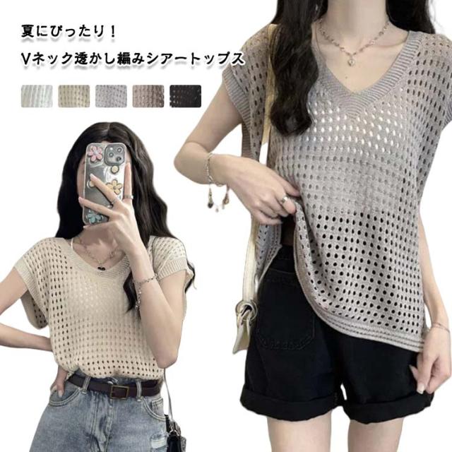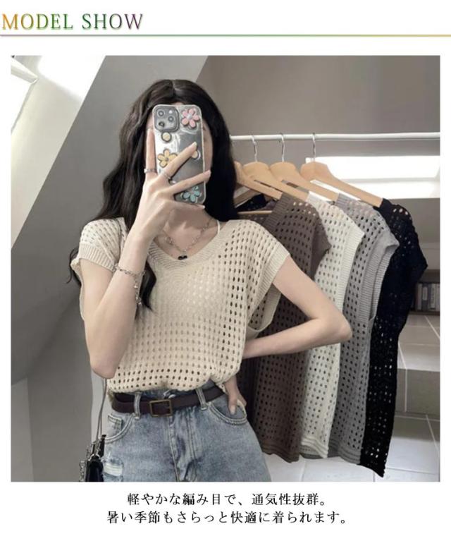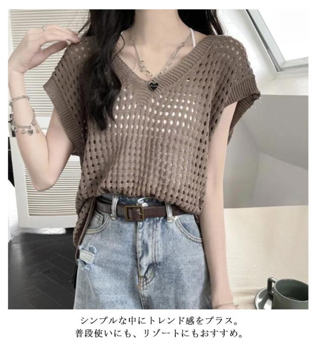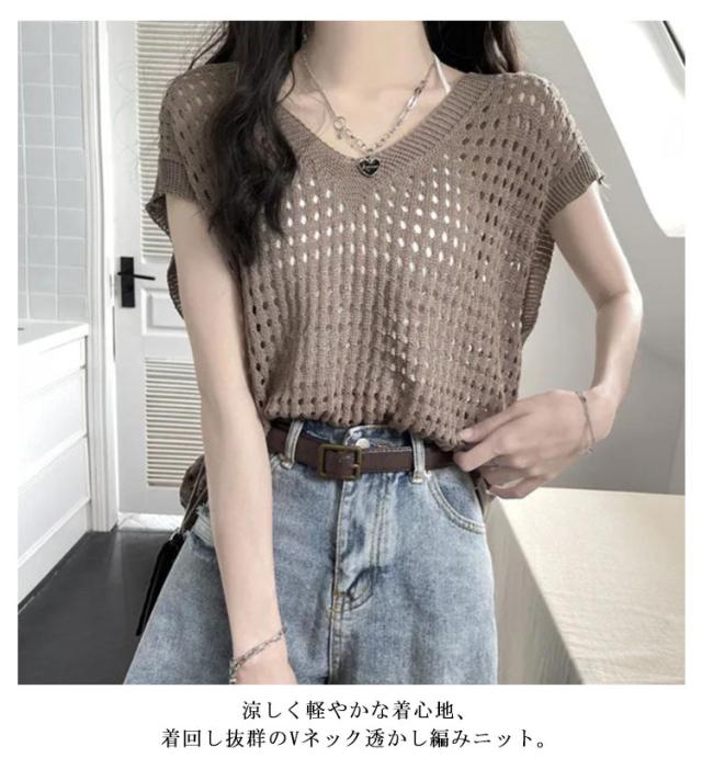 ベスト シアートップス プルオーバー 透かし編み ニット ニットトップス Vネック ニットトップス 透け感 メッシュ レイヤード 重ね着 シンプル サマーニット フレンチスリーブ ゆったり 体型カバー 春