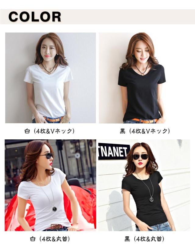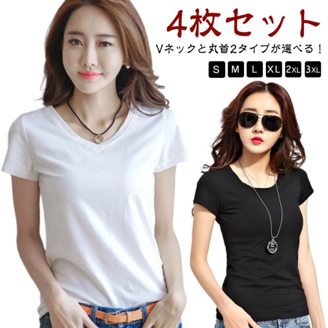 トップス 無地tシャツ レディース Tシャツ 【4枚セット】 【4枚セット】 半袖 丸首 無地 カットソー 薄手 白Tシャツ カジュアル シンプル インナーシャツ きれいめ 夏 スリム インナー 韓国 大きいサイズ Vネック 送料無料 S M L XL 2XL