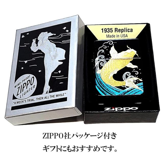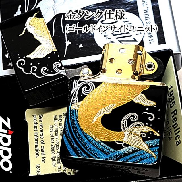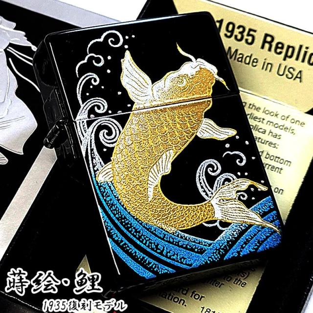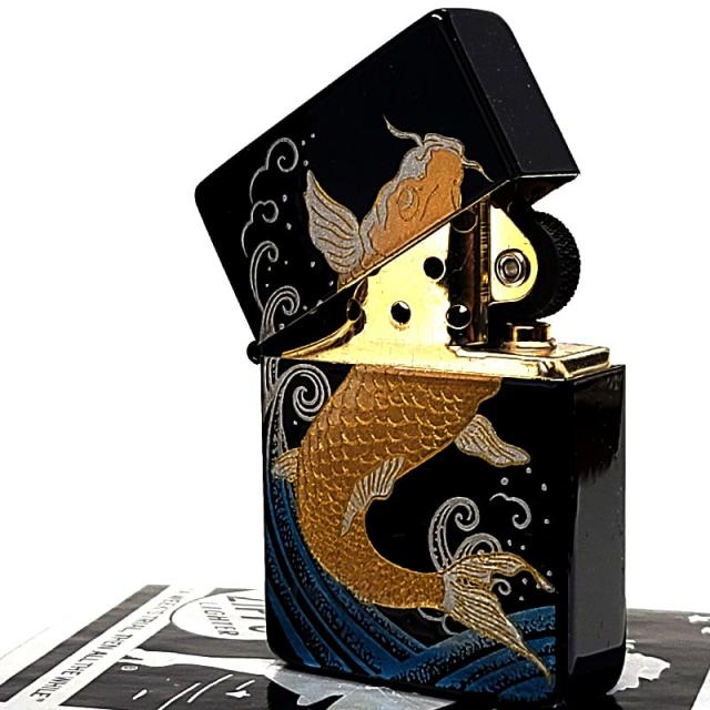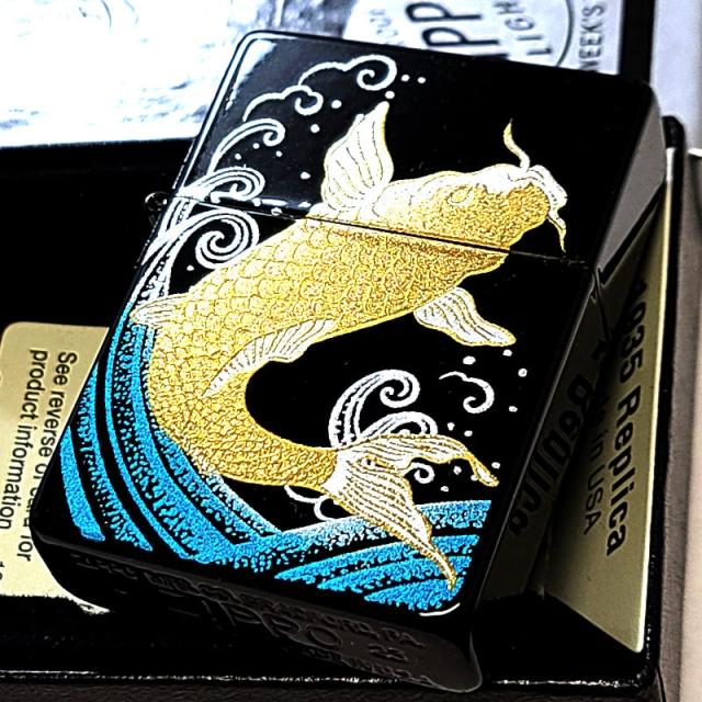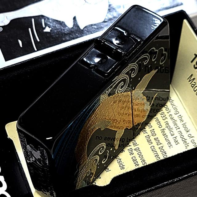 ZIPPO ライター 昇鯉 1935 復刻レプリカ 和柄 ジッポ 蒔絵 おしゃれ 角型 3バレル 和風 高級 黒 メンズ お守り 金タンク 日本 かっこいい ブラック ギフト プレゼント 動画あり