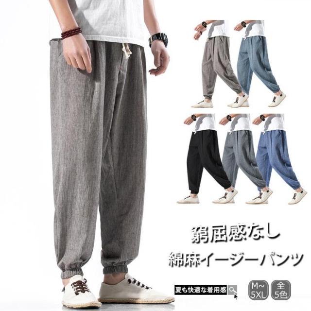 イージーパンツ メンズ 綿麻 サルエルパンツ ズボン 無地 爽やか ポケット 通気 吸湿 軽量 リラックス ゆったり 日常 部屋着 カジュアル 春 夏 ユニセックス
