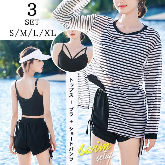 水着 ボーダーシャツ 体型カバー 3点セット タンキニ ラッシュガード ビキニ レディース 可愛い 日焼け止め セパレート パッド付 モテカワ 太もも