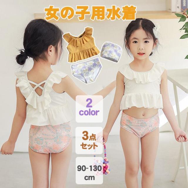 女の子 水着 セパレート 3点セット キャップ付き トップス+パンツ タンキニ 90 100 110 120 130 フリル付き 女の子水着 キッズ ガールズ スイムウエア ジュニア