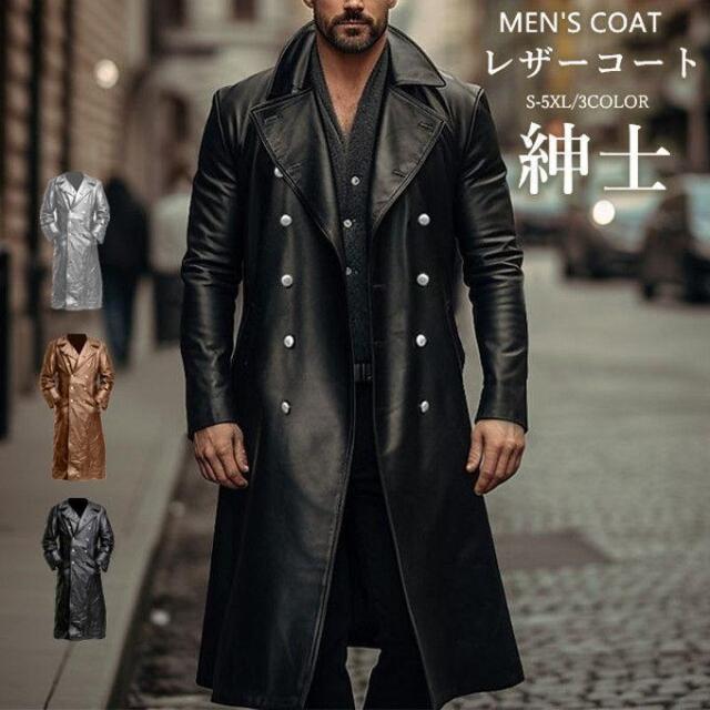 レザーコート ファッション メンズ トレンチコート 長袖 PU 革コート 撥水 無地 PU 皮革 アウター 紳士 ロング丈 ストリート カジュアル エレガント