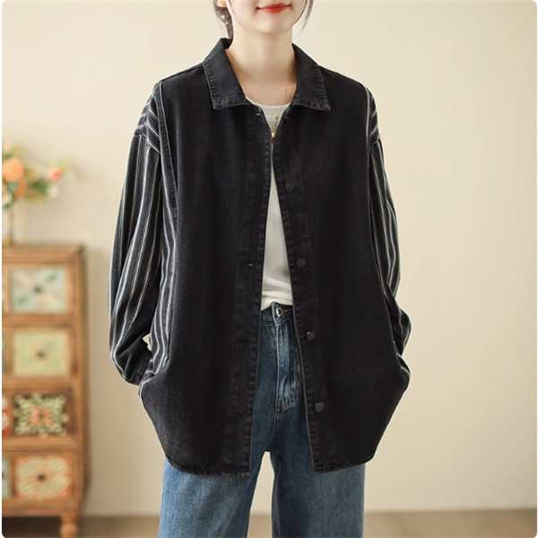 シャツ デニム 異素材 レディース トップス アウター シャツジャケット 切り替え 長袖 お尻が隠れる 羽織り ストライプ柄 ゆったりとしたシルエット