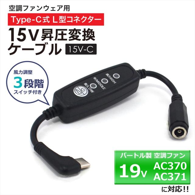 バートル BURTLE エアークラフト ファンユニット 2023年モデル 19V AC370 AC371 対応 Type-C昇圧 アダプター バートル対応 AIRCRAFT 空調ウェア 空調ファン付き作業服 15V L型 Type-C PD対応 モバイルバッテリー 昇圧ケーブル USB-C タイプC スイッチ付き 【15V-C】