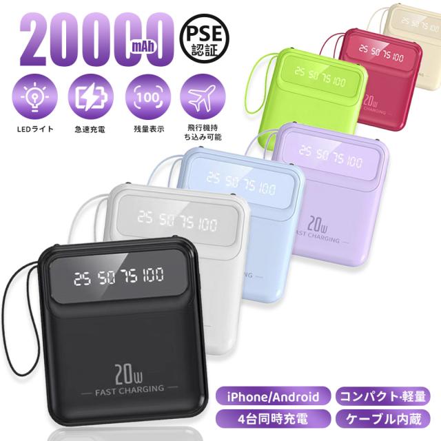 カラー:ブラック、ブルー、ベージュ、グリーン、レッド、ホワイト、パープル 容量:20000mAh 充電規格:20W高速充電 サイズ:超ミニ、コンパクトで持ち運び便利 届出事業者名:三木一雄株式会社 PSマークの種類:PSE 付属品: 4種のケーブル内蔵(iPhone/Android/Micro/USB-C対応) |