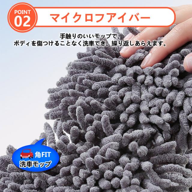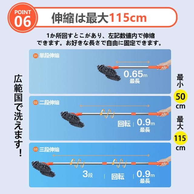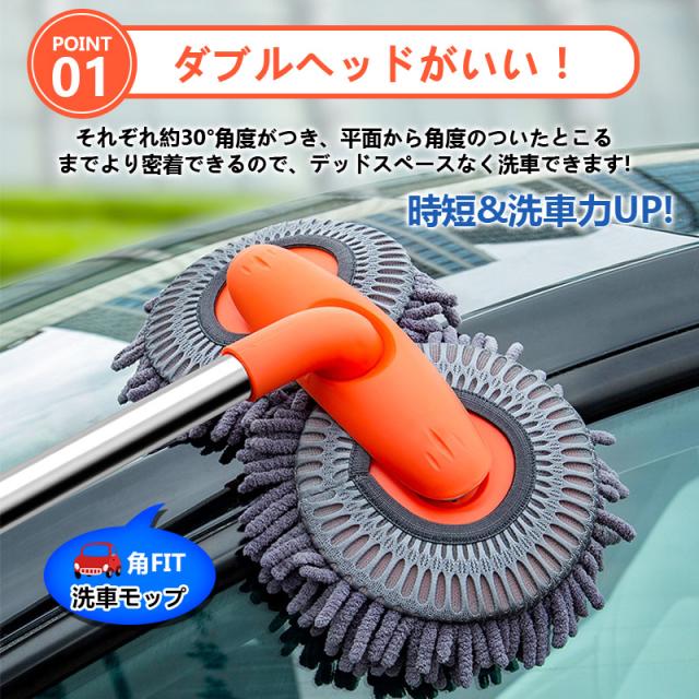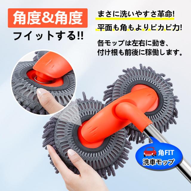 二つのモップがそれぞれ角度が付き、優しくしっかり洗い上げる吸収率抜群モップ、約50?115cmまで好きな長さに伸縮!これを使えば簡単に愛車を綺麗にできます。モップ部分だけも外せるのでしっかりキレイに清潔にできます。