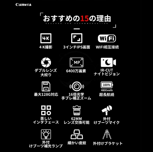 【20%超還元セレクト】カメラ デジタルカメラ デジカメ 安い 新品 ビデオカメラ 4K 6400万画素 IRナイトビジョン 16倍ズーム 電子手ブレ補正 F=2.7大絞りDVビデオカメラ クリスマス プレゼント 自撮り IRナイトビジョン VLOG Webカメラ Wifi転送 クリスマスプレゼント